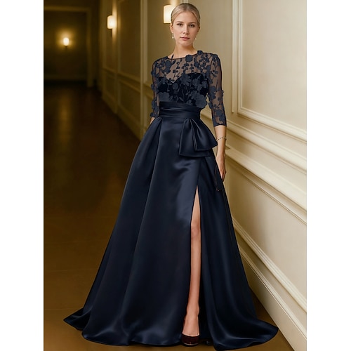 Linea ad A Lunghezza al pavimento Abito da Sera Da principessa Abito formale Elegante Spacco Alto Setoso Manica 3/4 Scollo Illusione Matrimonio Formale Tasca Raso Pizzo con Tasca