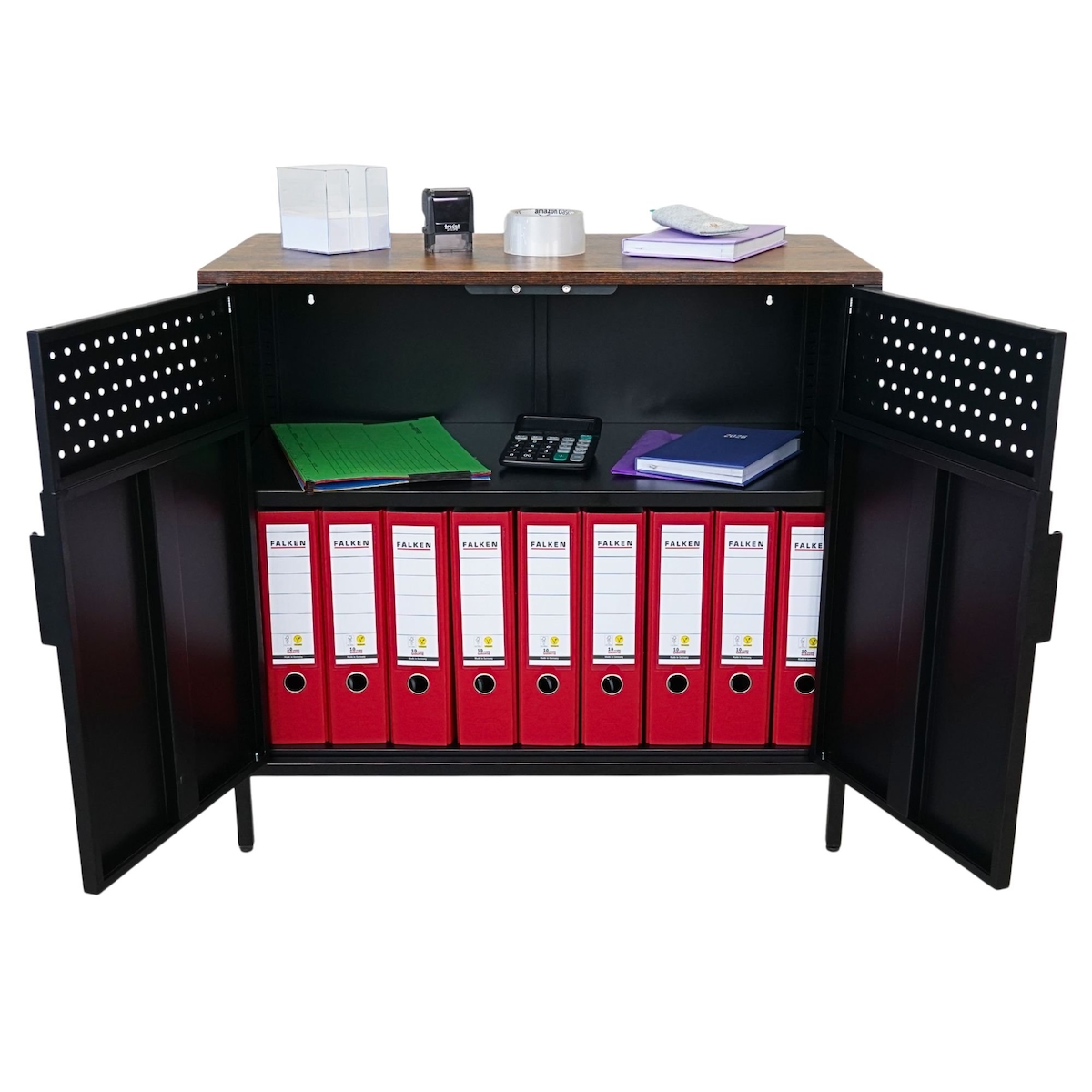 PROREGAL Aktenschrank LION Metall mit Beinen Metallschrank Doppeltür mit Magnetverschluss 76x80x40cm Kommode 2 Einlegeböden Stahl Vintagebraun/Schwarz