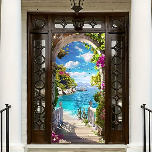 Tenda da porta con vista sull'oceano, prospettiva 3D, arazzo divisorio per camera da letto, cucina, ingresso, arredamento per la casa