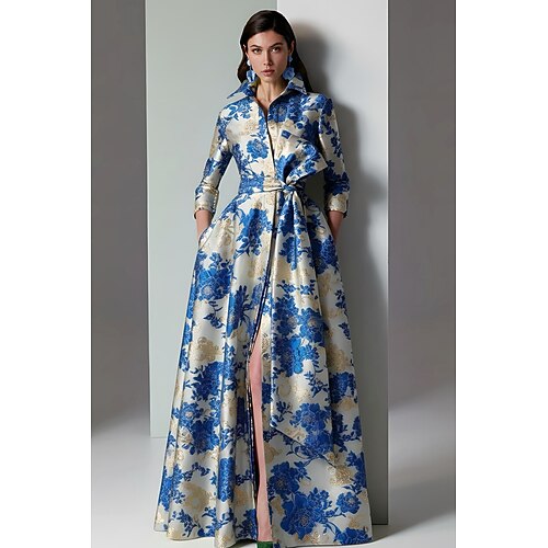 Linea ad A Lunghezza al pavimento Abito da Sera Elegante Scintillante Setoso Manica Lunga Colletto a Camicia Festa in giardino Matrimonio Tasca Jacquard con Stampa floreale Fiocco/Fiocchi Spacco