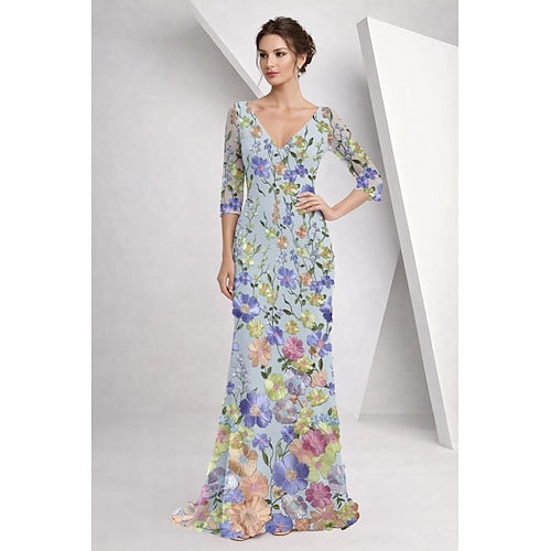 Linea ad A Lunghezza al pavimento Abito da cerimonia per signora Mezza Manica Scollo a V Elegante Vintage Formale Pizzo Tulle con Fiori 3D Ricamo Fiore