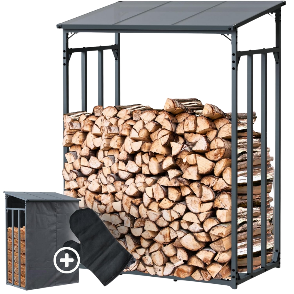 DELUKE® Kaminholzregal Außen mit Dach ELOS 130x70x185cm Metallrahmen, Inkl. Ofenhandschuh Brennholzregal außen Brennholzunterstand Kaminholzunterstand