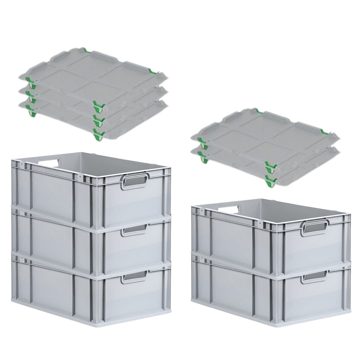 PROREGAL SparSet 5x Eurobox NextGen Economy mit Auflagedeckel & 4x Verschlüsse Grün, Griffe offen, HxBxT 22x40x60cm, 44L, Eurobehälter, Box