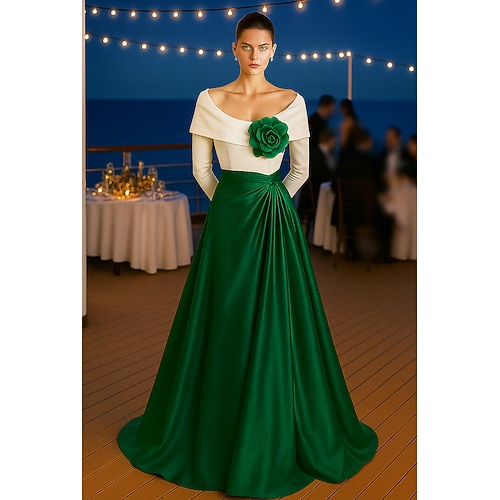 Linea ad A Lunghezza al pavimento Abito da Sera Da principessa Abito formale Elegante Monocolore Setoso Manica Lunga Senza Spalle Matrimonio Formale Tasca Raso con Pieghe Tasca Fiore sulla Spalla