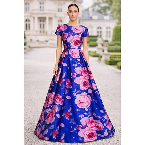 Linea ad A Lunghezza al pavimento Da principessa Abito formale Elegante Floreale Manica Corta Girocollo Festa in giardino Matrimonio Tasca Raso con Stampa floreale Tasca