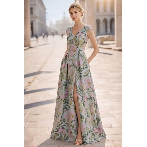 Linea ad A Lunghezza al pavimento Abito da Sera Da principessa Abito formale Spacco Alto Madre della sposa Senza Maniche Scollo a V Formale Ospite di nozze Tasca Raso con Stampa floreale Spacco Tasca