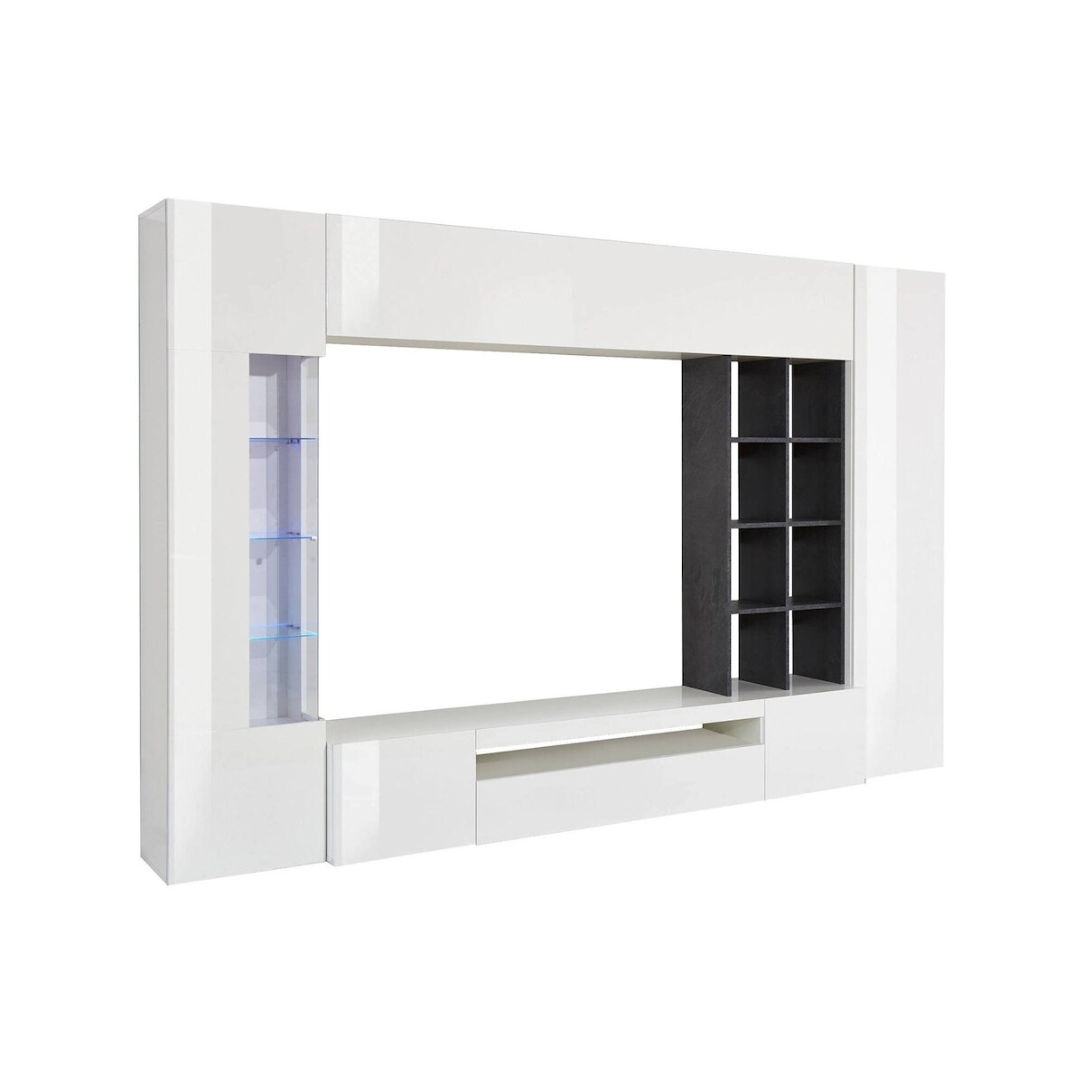 Dmora Wohnzimmermöbel Ocean, TV-Ständer Wohnzimmer-Set, Mehrzweck-Wohnzimmermöbel mit LED-Beleuchtung, cm 290x40h192, glänzend weiß und Schiefer
