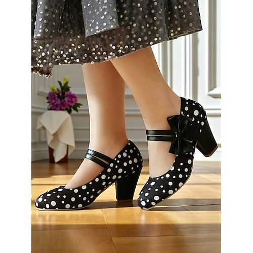 Scarpe col tacco Mary Jane a pois rosa da donna anni '50 – graziose décolleté con tacco a blocco retrò e cinturino a fiocco per feste, tè e outfit di ispirazione vintage