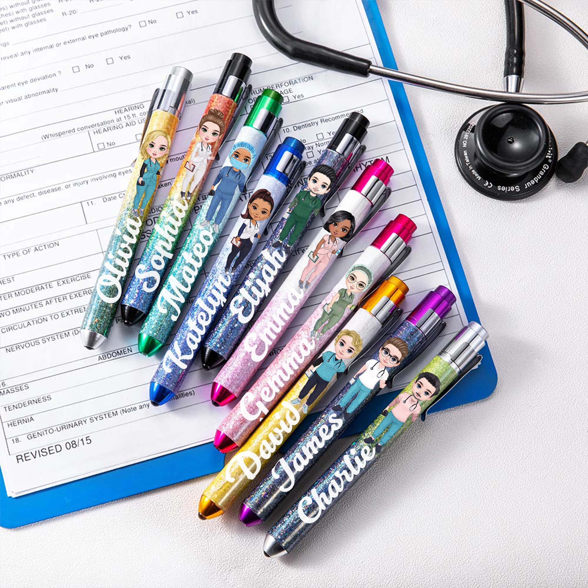 Personalizado Cartoon Character Glitter Medical Portable LED Pen Light con Nombre Semana de la Enfermera Apreciación Cumpleaños Regalo para el personal médico de la enfermera del doctor