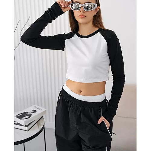 Per donna Top a maglia a coste T-shirt Raglan Tinta unica Vintage Elegante Classico Manica Lunga Girocollo Top corti Quotidiano Sportivo Weekend Patchwork Blocco di colore Bianco e nero Nero e grigio