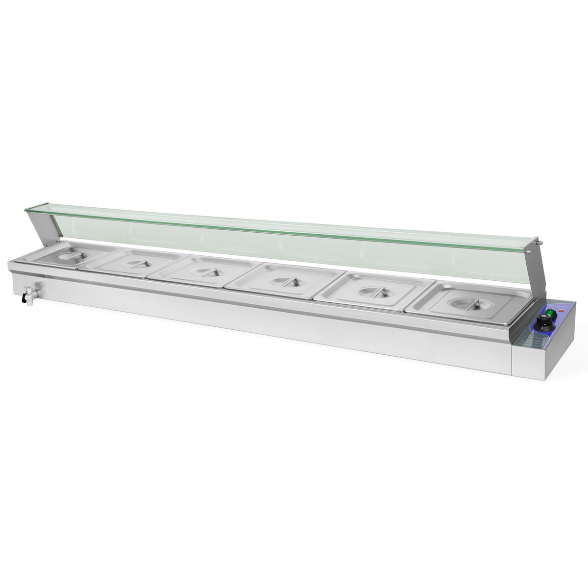 Vertes Speisenwärmer Buffetwärmer 1800W Edelstahl, 6x 1/2 GN Behälter (6x 6L), Ablasshahn, Glasabdeckung, Bain Marie, 50-200°C