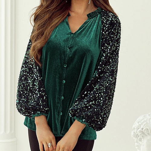 Per donna Velluto Elegant Elegante Blusa Semplice Elegante Manica Lunga Scollo a V Top Regolari Quotidiano Ferie Uscire Paillettes Arricciato Volant Vino Verde Primavera Autunno