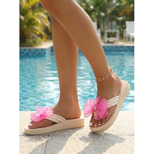 infradito da donna con plateau color crema e grande fiocco in organza rosa: sandali chic impreziositi da strass per il relax a bordo piscina, le vacanze al mare e i resort estivi