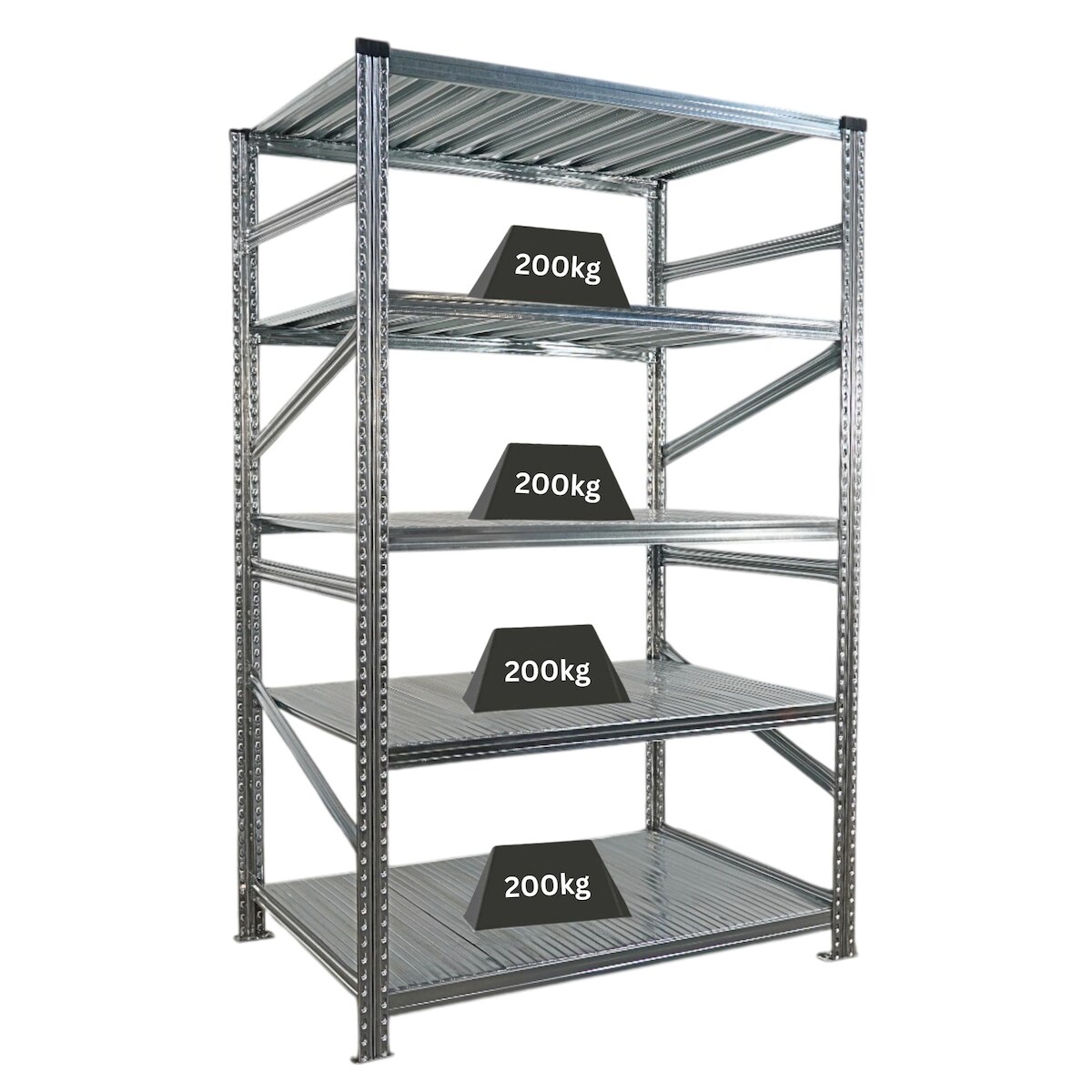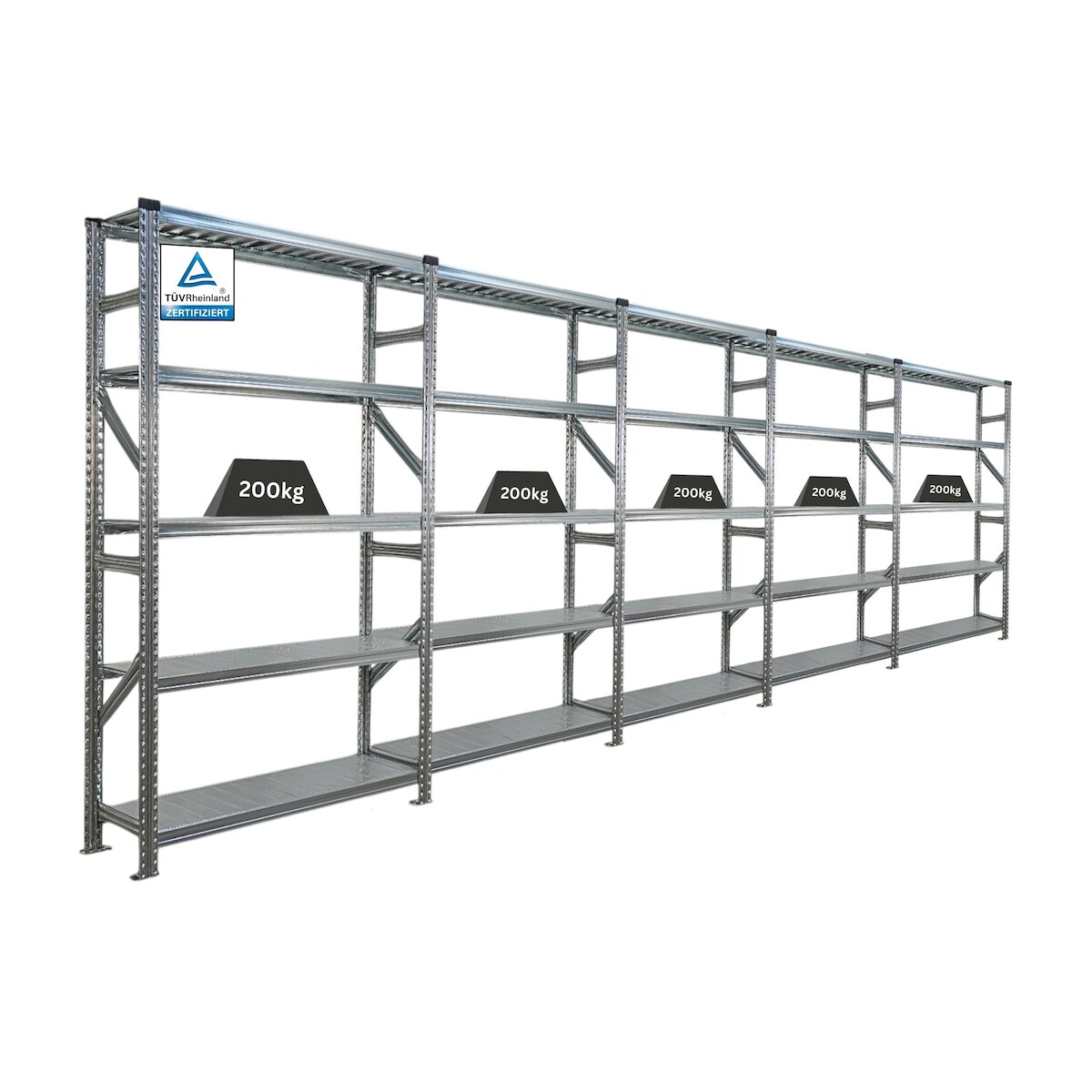 PROREGAL Fachbodenregal PROXIMO Stecksystem | Grundregal | HxBxT 200x120x80cm | 5 Ebenen | Fachlast 200 kg | Beidseitig nutzbar | Verzinkt