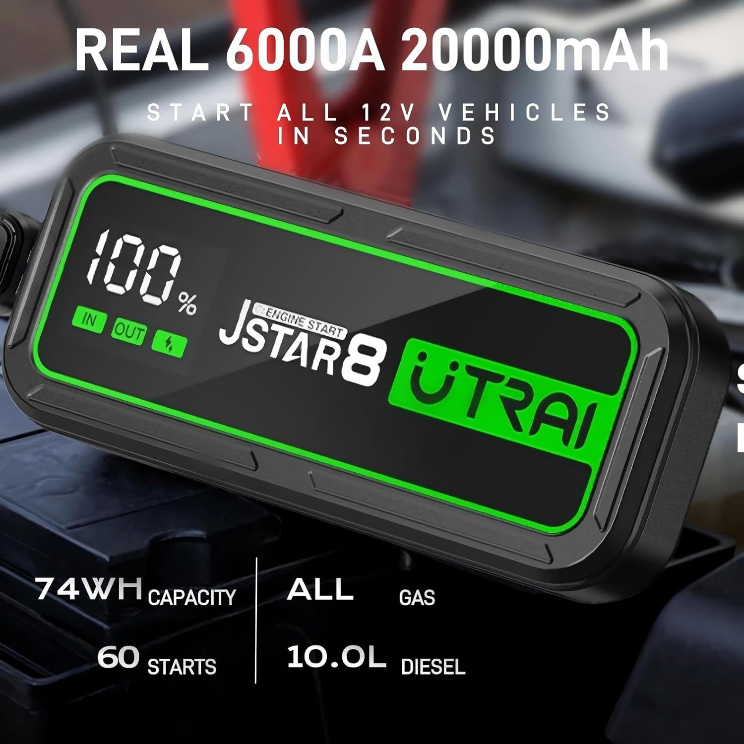 6000A Bærbar Startbooster, 12V 20000mAh 18W Type-C, LED-skjerm, 3-i-1 Lommelykt, Bilbatterilader for Bensin/Diesel