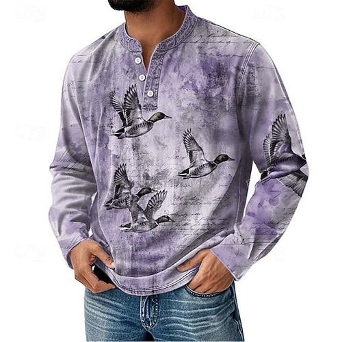 Per uomo Grafico Uccello Maglia Henley Maglietta Manica Lunga Moda Quotidiano Retrò Vintage Casuale Ferie Uscire Primavera Autunno Blu chiaro Viola Cachi Grigio Henley Maglietta Henley