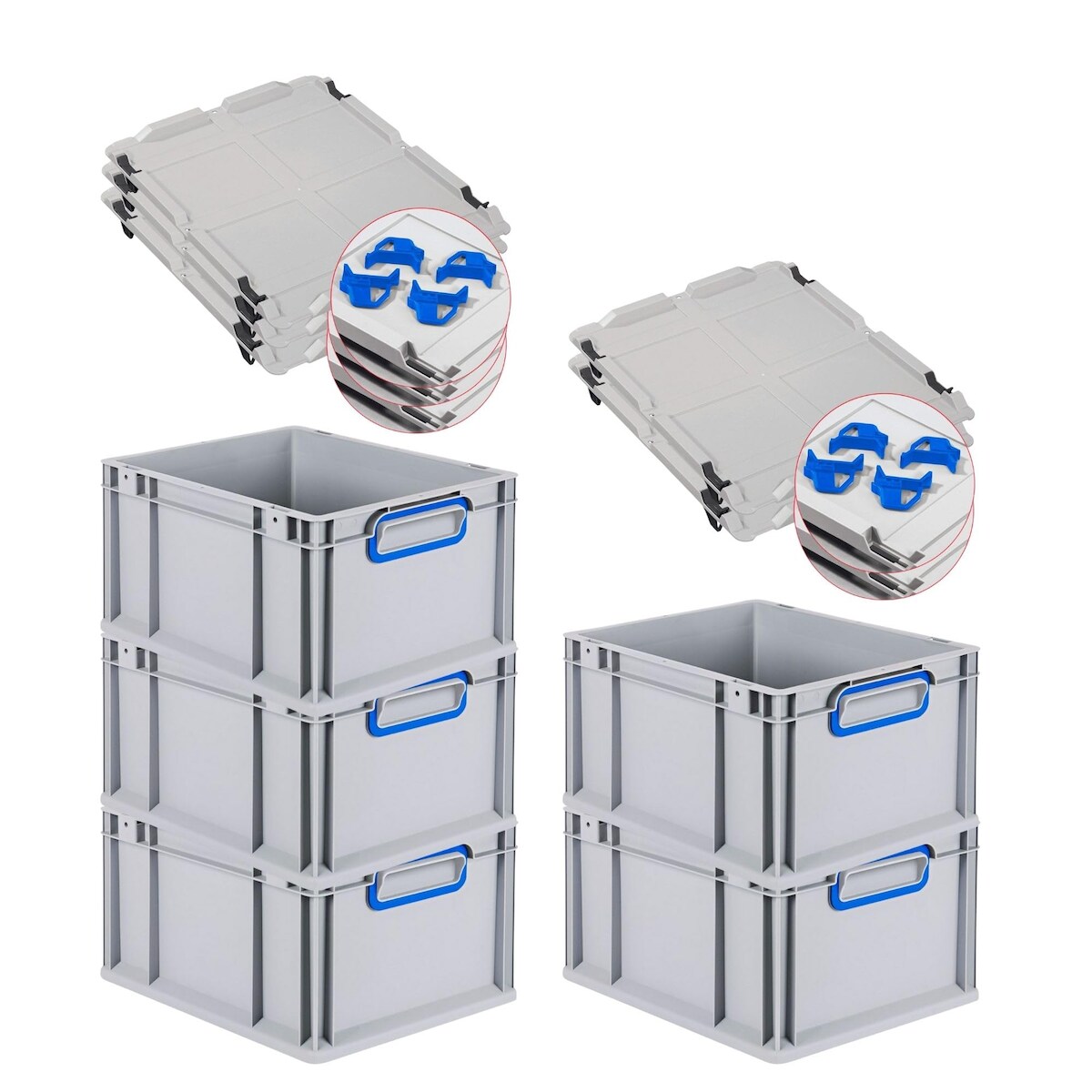 PROREGAL SparSet 5x Eurobox NextGen Color mit Auflagedeckel & Verschlüsse, HxBxT 22x30x40cm, 20L, Grau, Griffe blau zu, Eurobehälter, Box