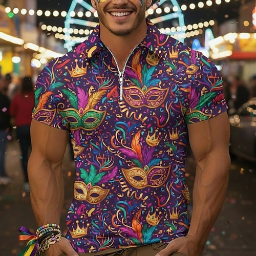 Per uomo Polo Polo con zip Casuale Quotidiano Bavero Manica Corta Moda Hawaiano Grafico Maschera Stampa Zip a un quarto Estate Primavera Vestibilità su misura Viola scuro Viola Polo