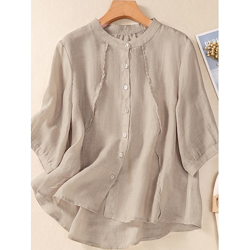 Per donna Camicia Camicie di cotone e lino Blusa Tinta unica Essenziale Casual Manica 3/4 Collo a V Top Regolari Quotidiano Bianco Rosa Verde Estate Primavera