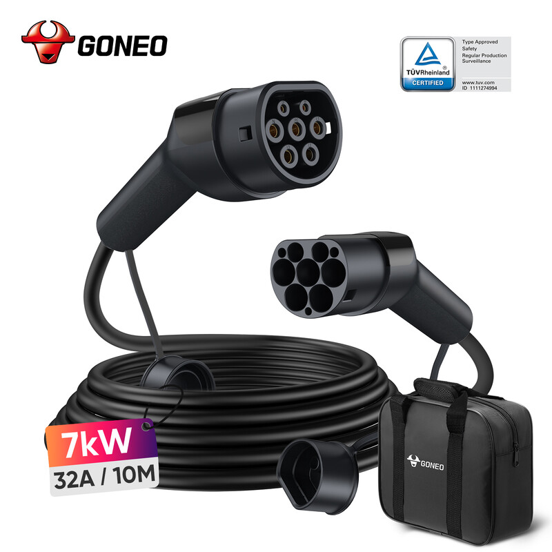 Câble de recharge Type 2 GONEO 7KW 32A 10m Monophasé Certifié TÜV Soudure ultrasons Connecteur plaqué argent IP54 étanche ignifugé PA66+TPU avec étui