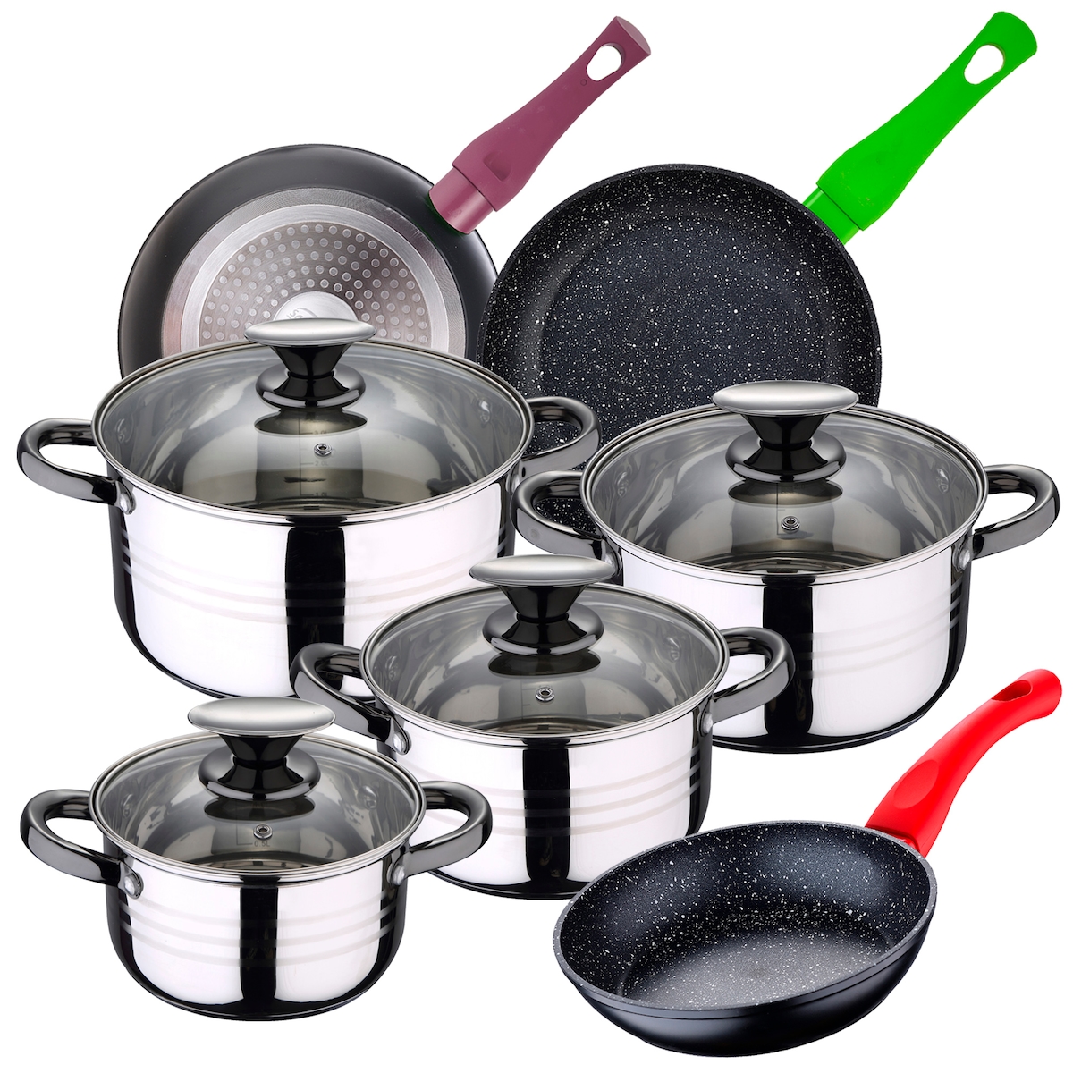 San Ignacio - Cassel 14/16/18/20/24 cm Edelstahl-Kochgeschirrset mit 18/22/26 cm Daimiel-Pfannenset aus geschmiedetem Aluminium