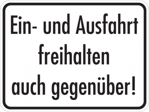 Hinweisschild, Ein- und Ausfahrt freihalten auch gegenüber, 300x400mm, Alu geprägt - 400x300x0.6 mm Aluminium geprägt