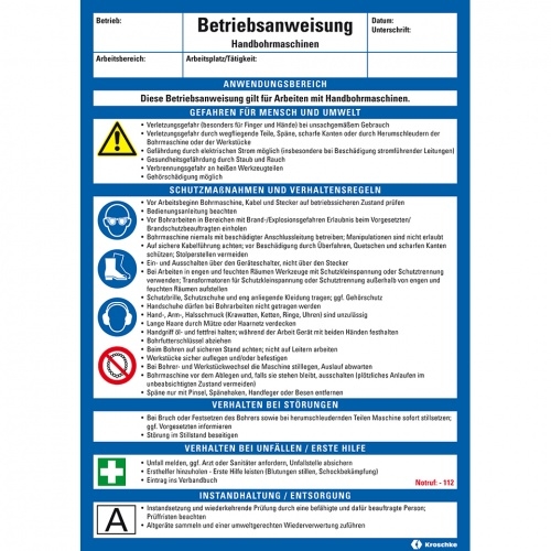 König Werbeanlagen Dreifke® Maschinenbetriebsanweisung Handbohrmaschinen, Kunststoff, 210x297mm, ASR A1.3, DIN EN ISO 7010