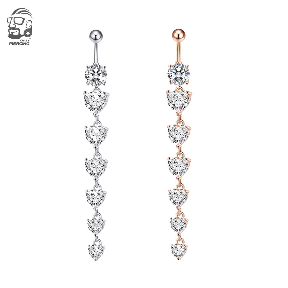 7 Heart Crystals Long Dangled Belly Button Rings Surgical Steel Cute Navel Piercing Nombril 14g Cuved Bar Body Piercings Jewelry