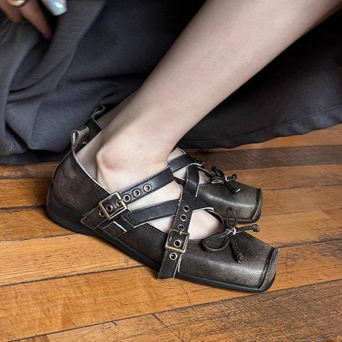 Polished new retro belt buckle ballet shoes women's flat Mary Jane shoes rivets soft bottom bow single shoes women cm