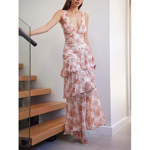Per donna Abito maxi Abito a trapezio Abito con balze Casual All'aperto Uscire Vestibilità regolare Floreale Senza Maniche Scollo a V Giallo Rosa Rosso Verde scuro Estate Primavera
