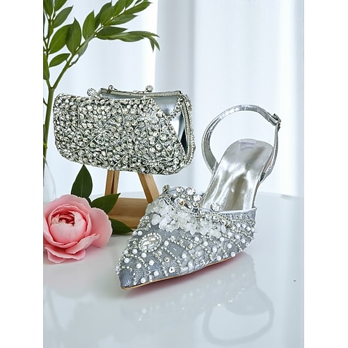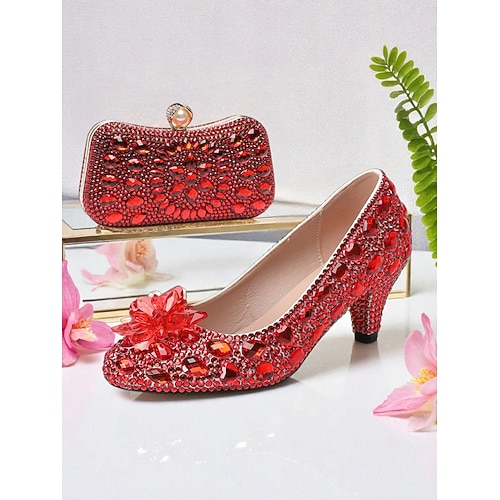 set da donna con tacchi e pochette in strass e decorazioni in cristallo multicolore: eleganti scarpe e borsa abbinate per eventi formali e cocktail party