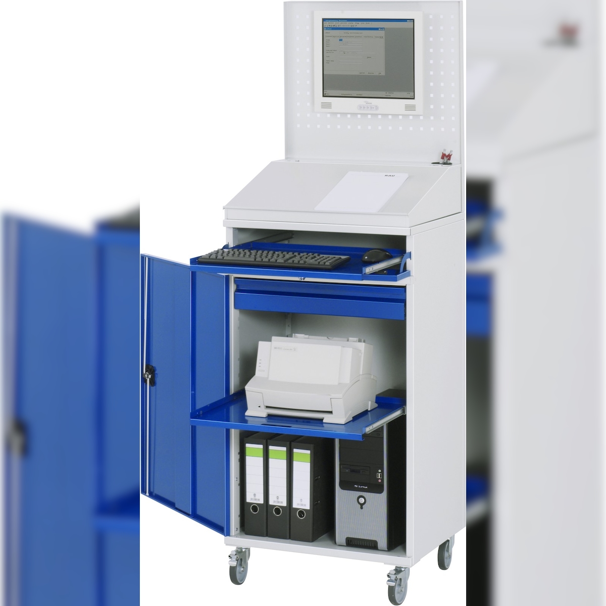 Computer-Arbeitsstation, Monitorgehäuse, 2 Ausziehböden, Breite 1100 mm, anthrazit / enzianblau RAU