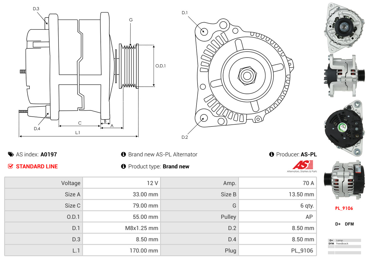 AS-PL Generator A0197 12V 70A für VW MAZDA FORD 96FB-10300-DA 1108479 1025547