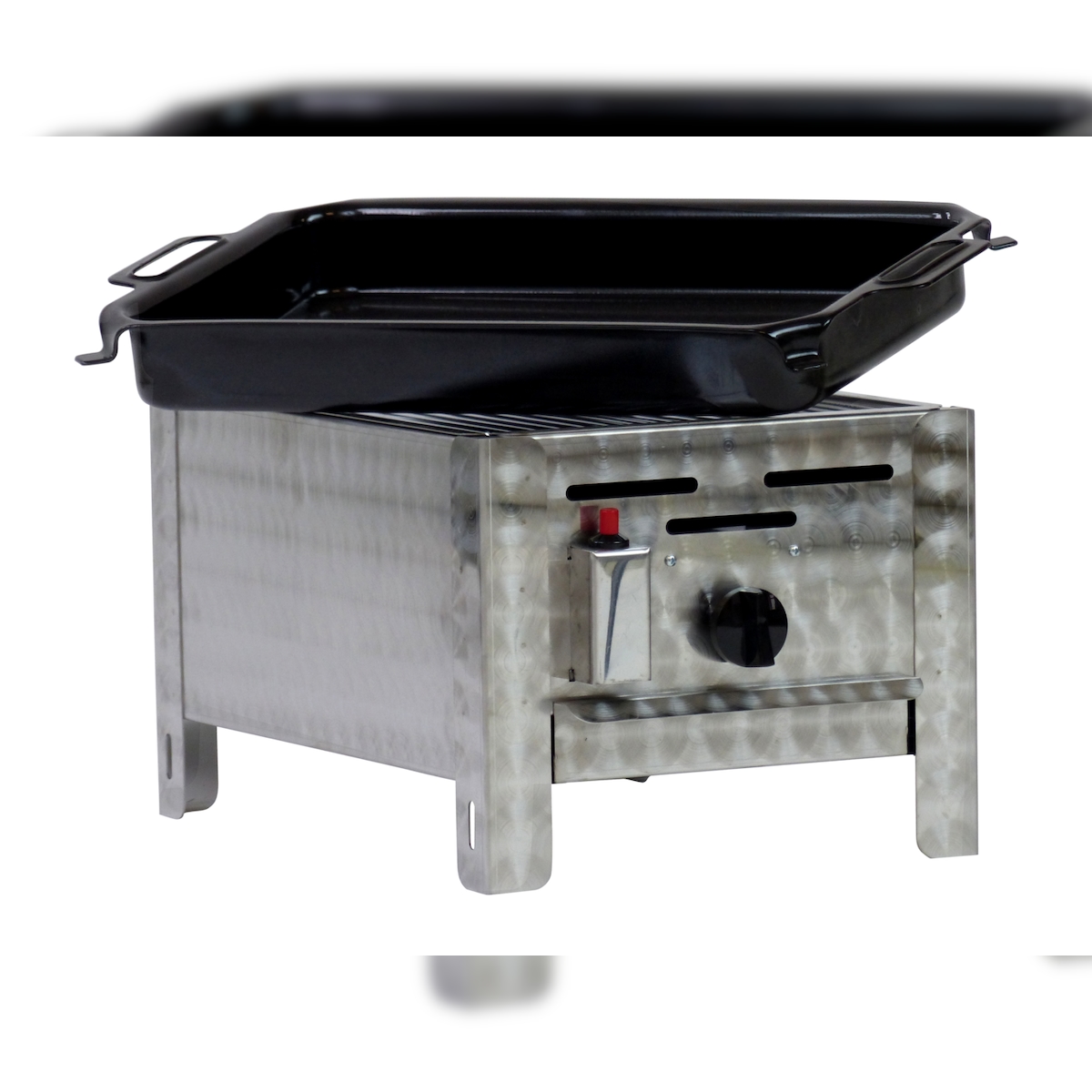 Gastrobräter, 1 Brenner 4,5 kW, mit Grillrost u. emaill. Stahlpfanne, B 340 x T 530 x H 270 mm, inkl. Gewerbedruckregler u. Schlauchbruchsicherung