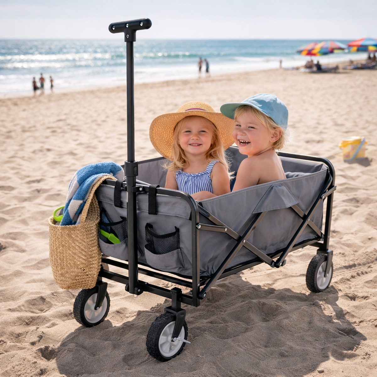 Hauki Bollerwagen XXL Blau-Grau, faltbar mit Dach & Tasche, 360° Räder, Handwagen 120 kg, Transportwagen Kinder, Schiebe-/Ziehbar
