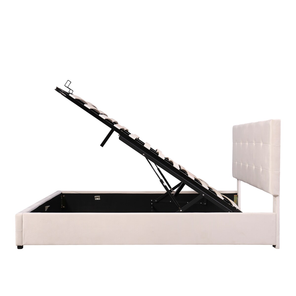 OKWISH Polsterbett 140x200 cm mit hydraulischem Stauraum, Metallrahmen, 24 Latten, weicher Samtstoff, modernes Plattformbett, Cremeweiß