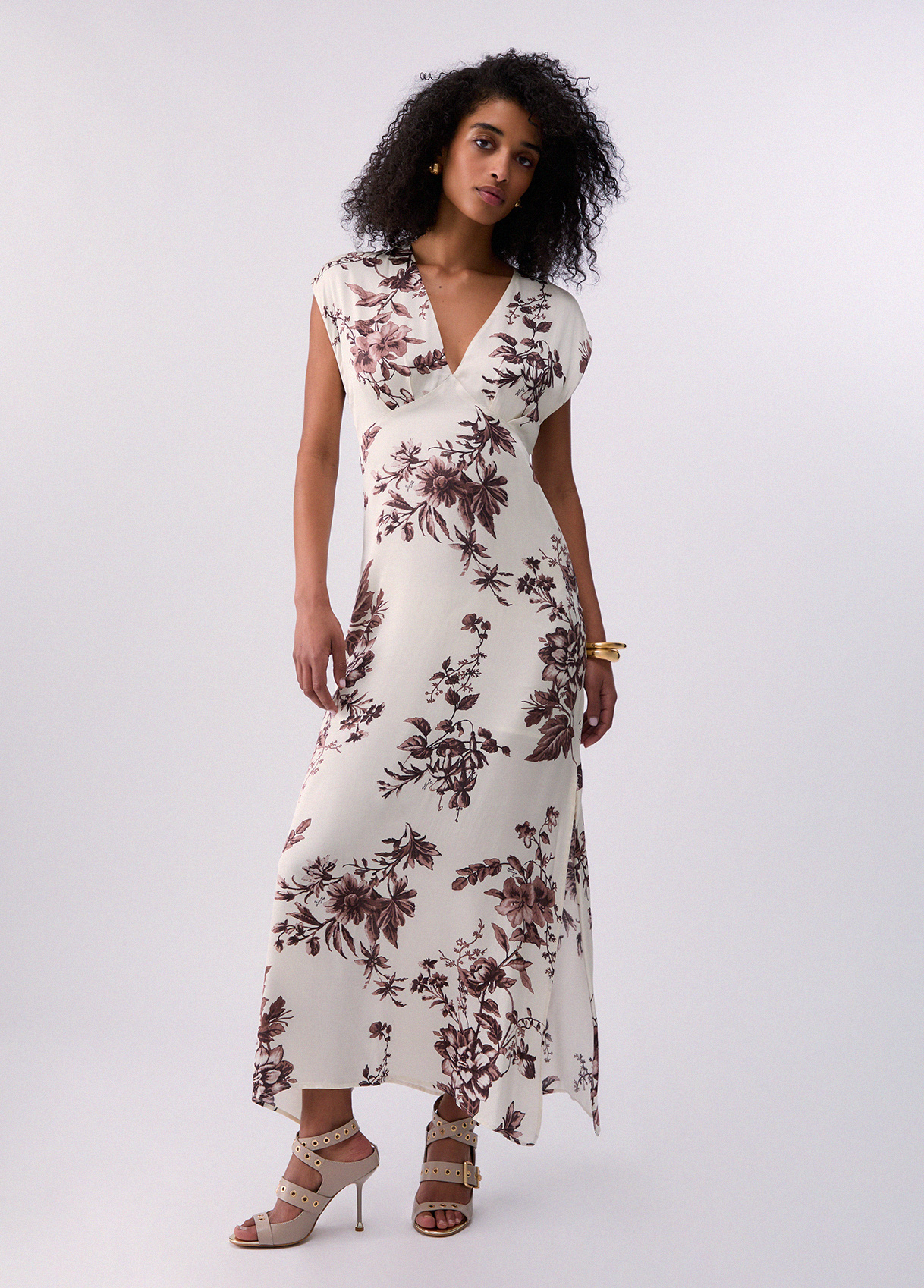 Liu Jo Langes Kleid Aus Bedrucktem Satin, Weiß Und Braun, 42