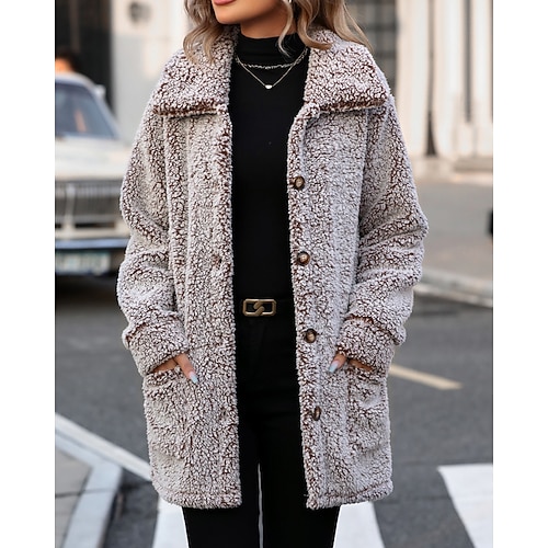 Per donna Cappotto Teddy Giacca Casual Caldo Confortevole Tasca Bottoni Casual Semplice All'aperto Vacanza Casa Uscire Regolare Collo ripiegato Vestibilità comoda Manica Lunga Capispalla Nero Caffè