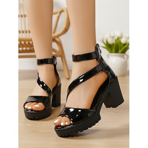 sandali eleganti con tacco nero lucido da donna - scarpe con plateau asimmetriche e cinturino sicuro - sandali versatili con tacco a blocco per appuntamenti a cena eventi semi-formali