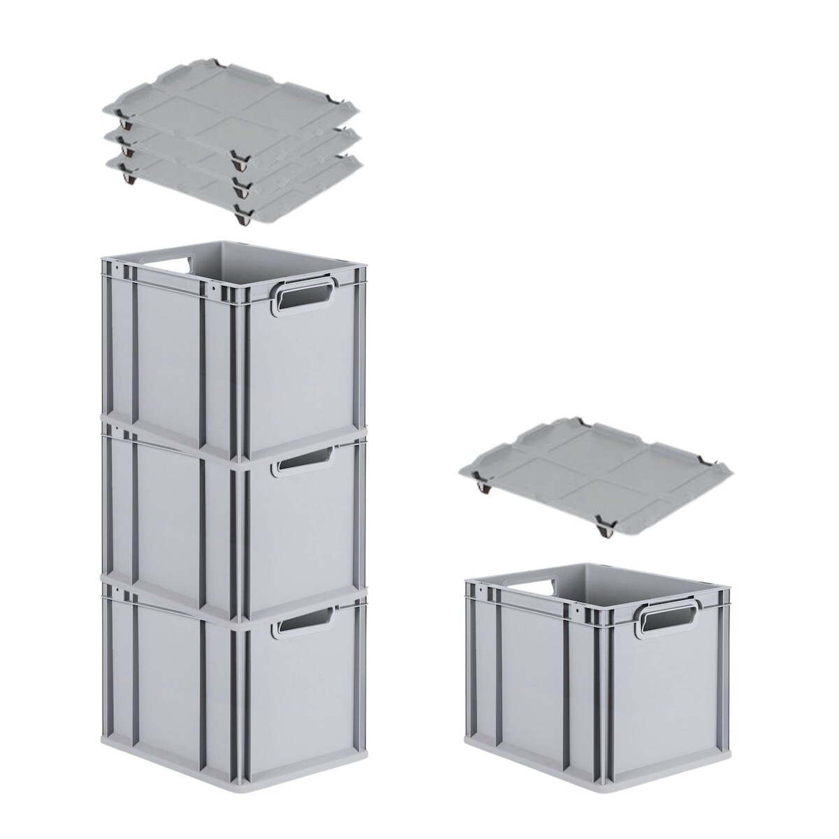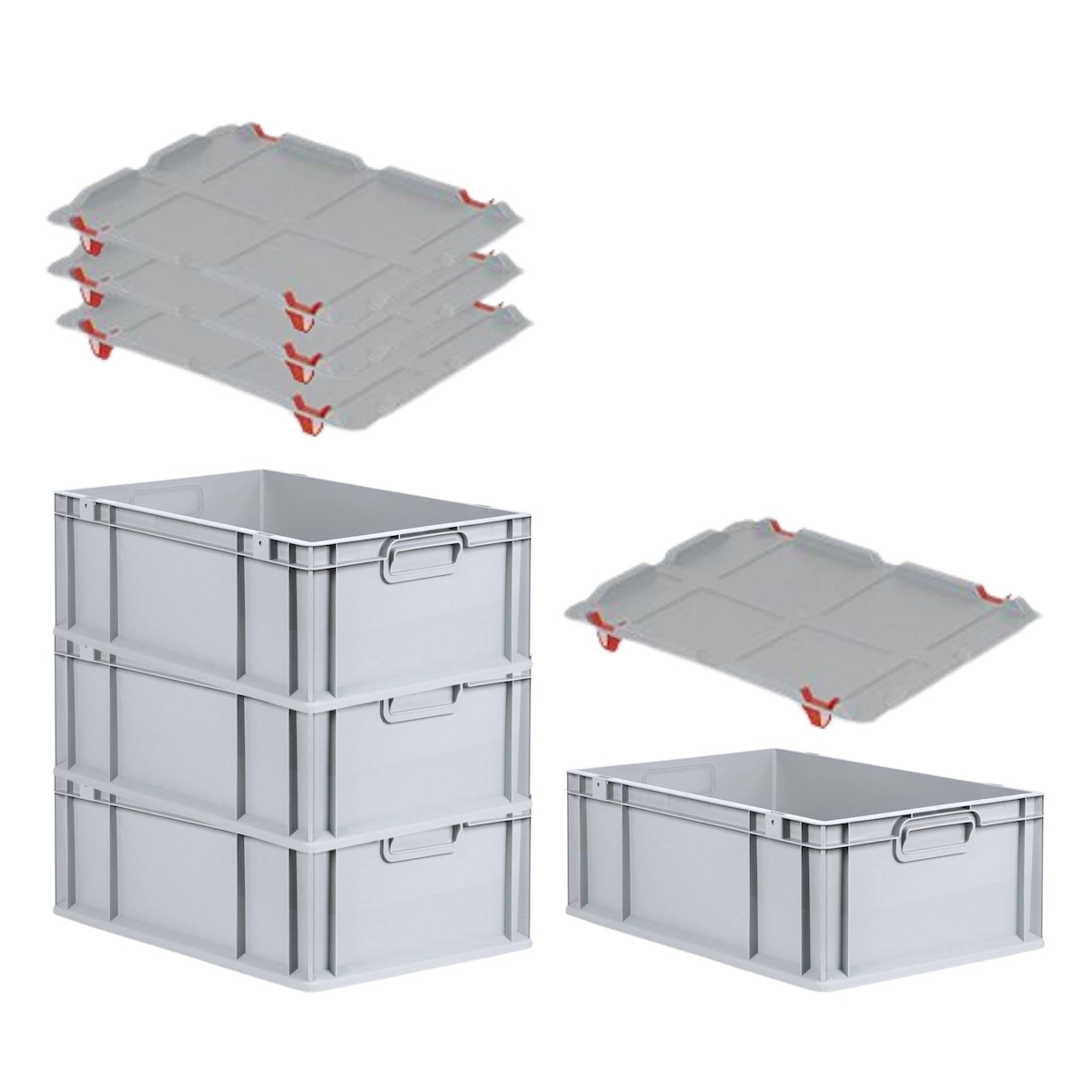 PROREGAL SuperSparSet 4x Eurobox NextGen Economy mit Auflagedeckel & 4x Verschlüsse Schwarz, Griffe offen, HxBxT 32x30x40cm, 30L, Eurobehälter, Box