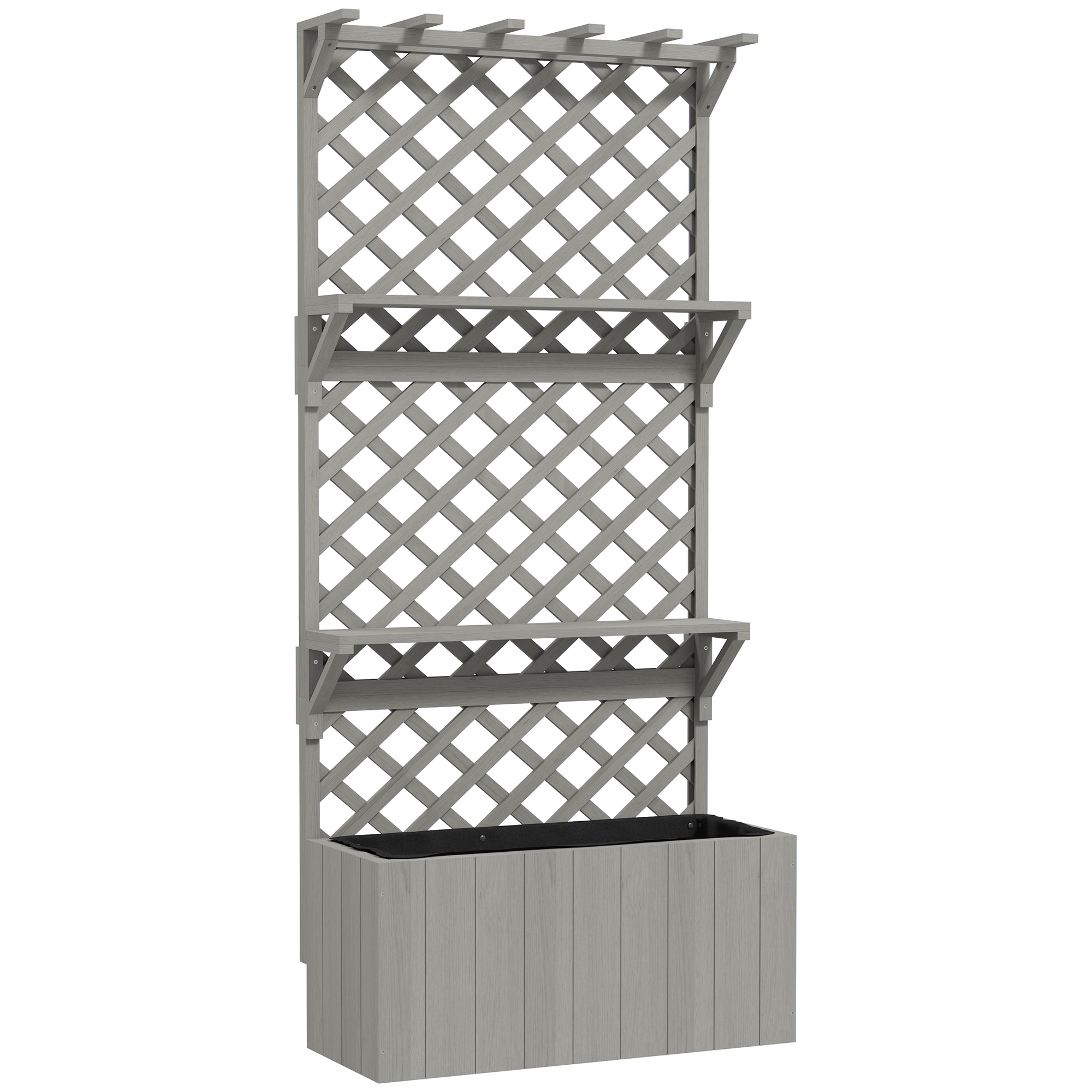 Outsunny 52L Wooden Planter with Trellis, Freestanding Raised Bed for Garden with Hanging Roof, Shelves, Drainage Holes and Bed Liner, Outdoor Planter Box for Climbing Plants Vegetables Flowers, Grey