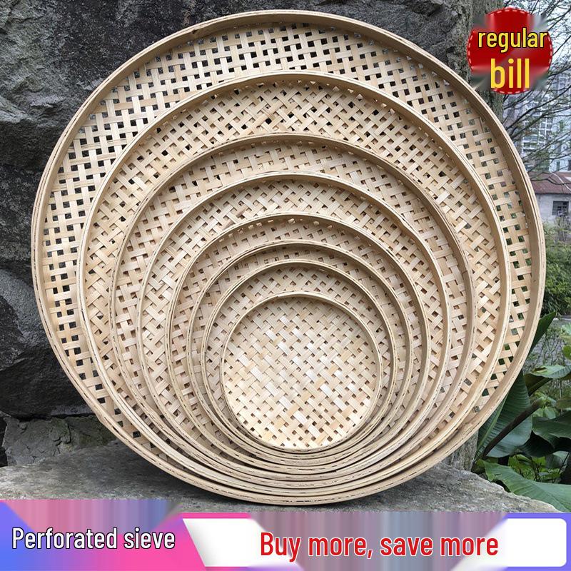 Rund flätad bambukorg och bricka för rensning, torkning och siktning av ris eller te, handgjord med hål.