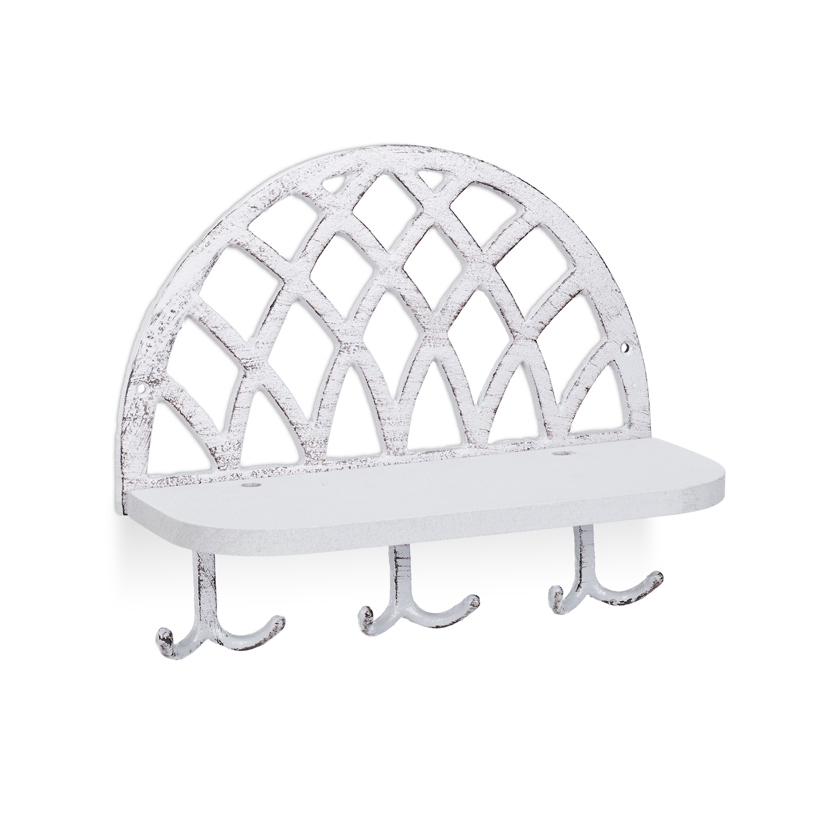 Relaxdays Wandregal mit Hakenleiste, Metall & Holz, Gitter-Design, Wandgarderobe 6 Haken, HxBxT: 17 x 36 x 13 cm, weiß