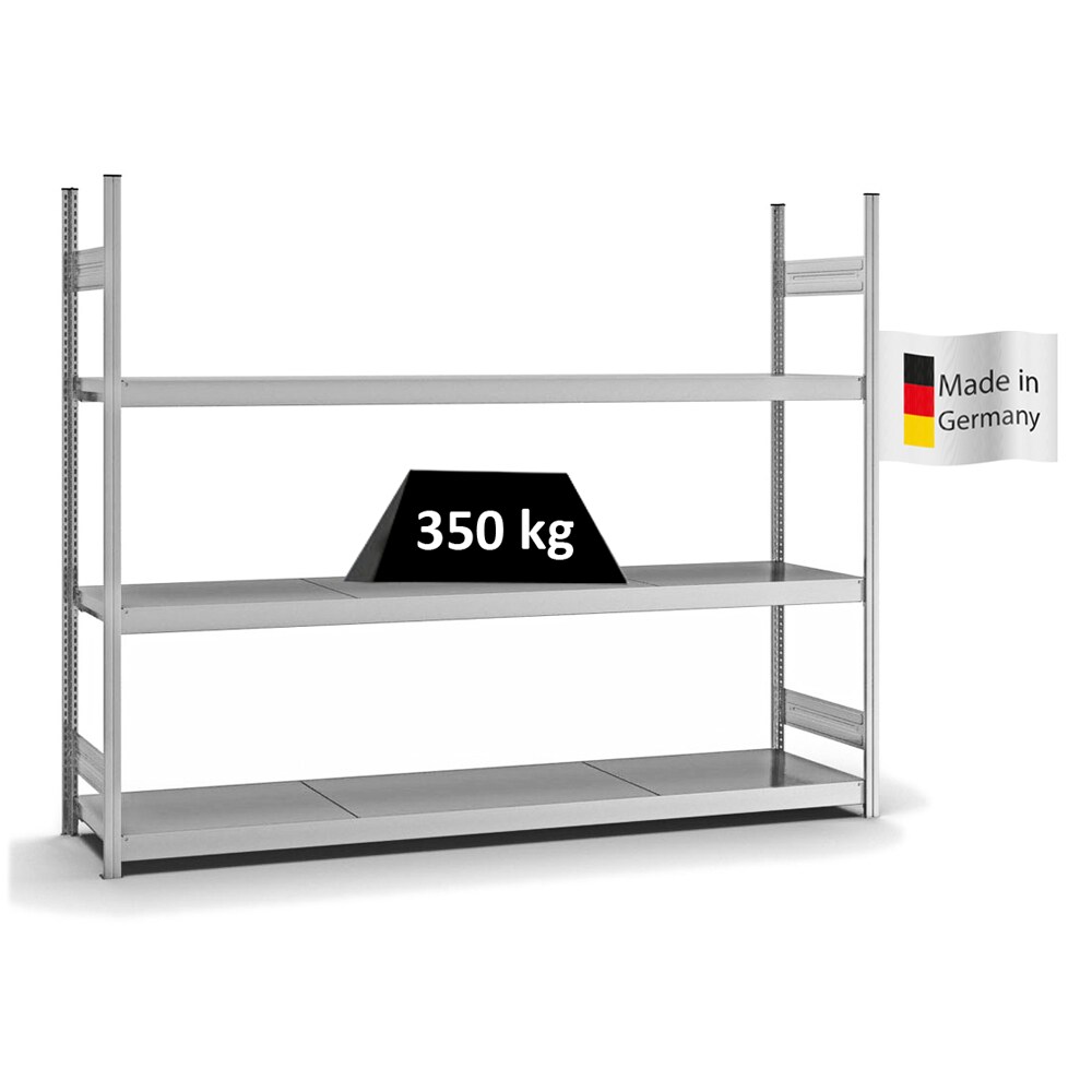 PROREGAL Weitspannregal Stecksystem T-Profil | HxBxT 200x250x60cm | 3 Ebenen | Stahlplatten-Fachboden | Fachlast 350kg | Verzinkt | Lagerregal