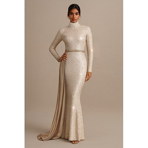 Sirena Tromba Lunghezza al pavimento Abito da Sera Elegante Scintillante Stile Celebrità Manica Lunga Collo Alto Festa in giardino Matrimonio Con Paillettes con Glitter
