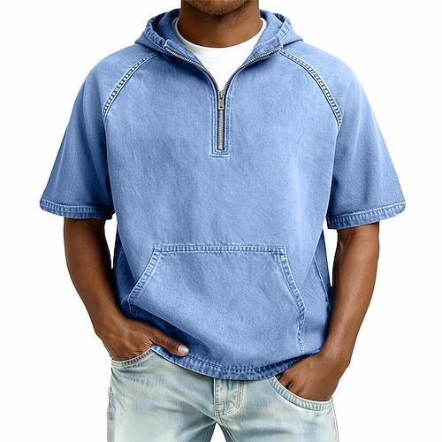 Da uomo Camicia di Jeans Maglietta di cotone Maglietta Manica Corta Con Cappuccio Estate Primavera Tutte le stagioni Tinta unica Retrò Vintage Angosciato Con zip All'aperto Streetwear Casual Blu