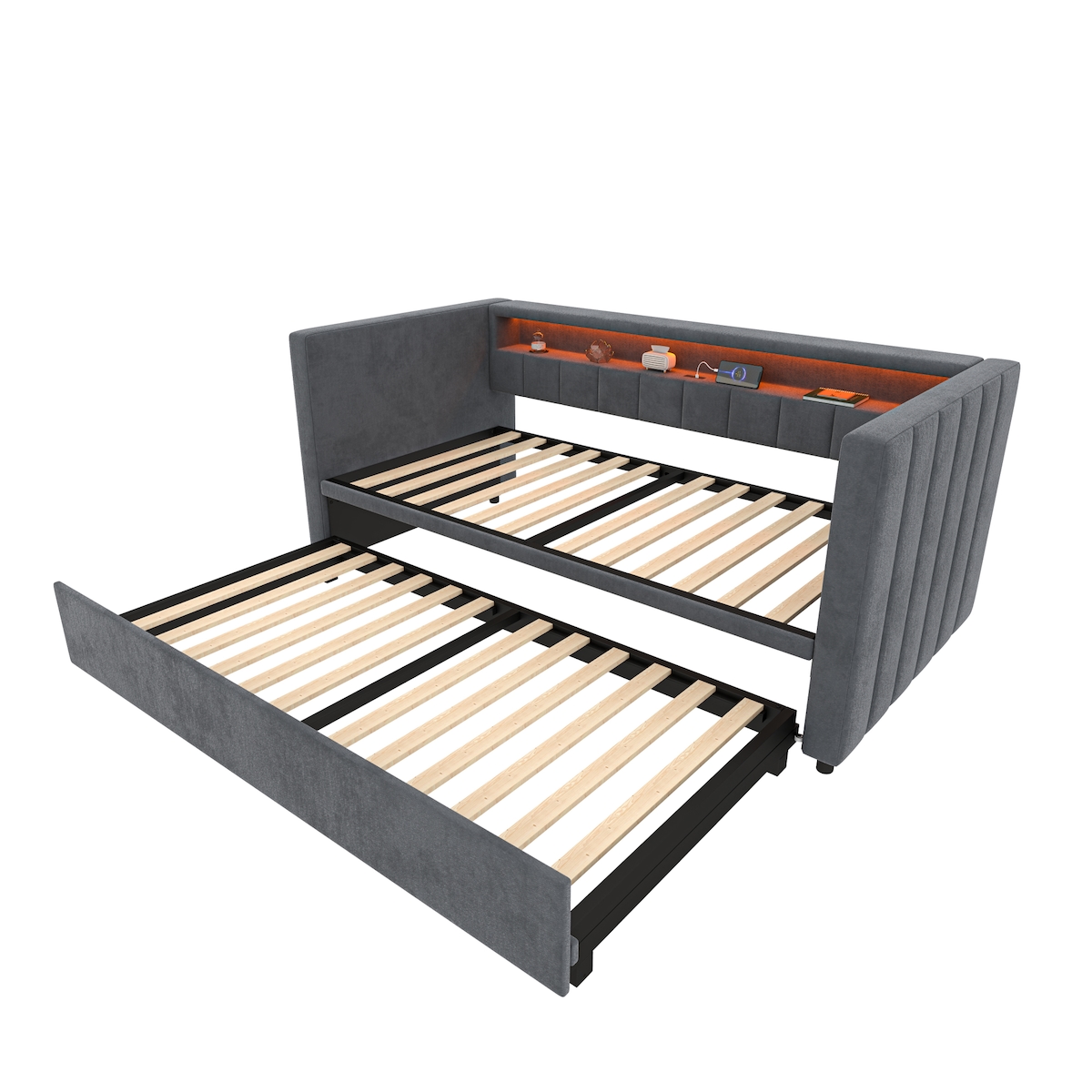 Merax Einzelbett, Daybett 90x190 cm Multifunktionales Schlafsofa mit ausziehbarem Bett, USB-Type-C-Anschluss, LED-Ambiente, Samtbezug & Stauraum, grau