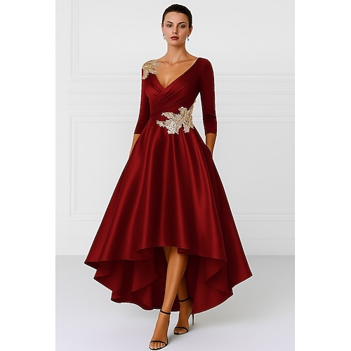 Linea ad A Asimmetrico Vestito da Festa Abito da Cocktail Abito da invitata a nozze Abito da cerimonia per signora Manica Lunga Scollo a V Elegante Formale Raso con Applicazioni