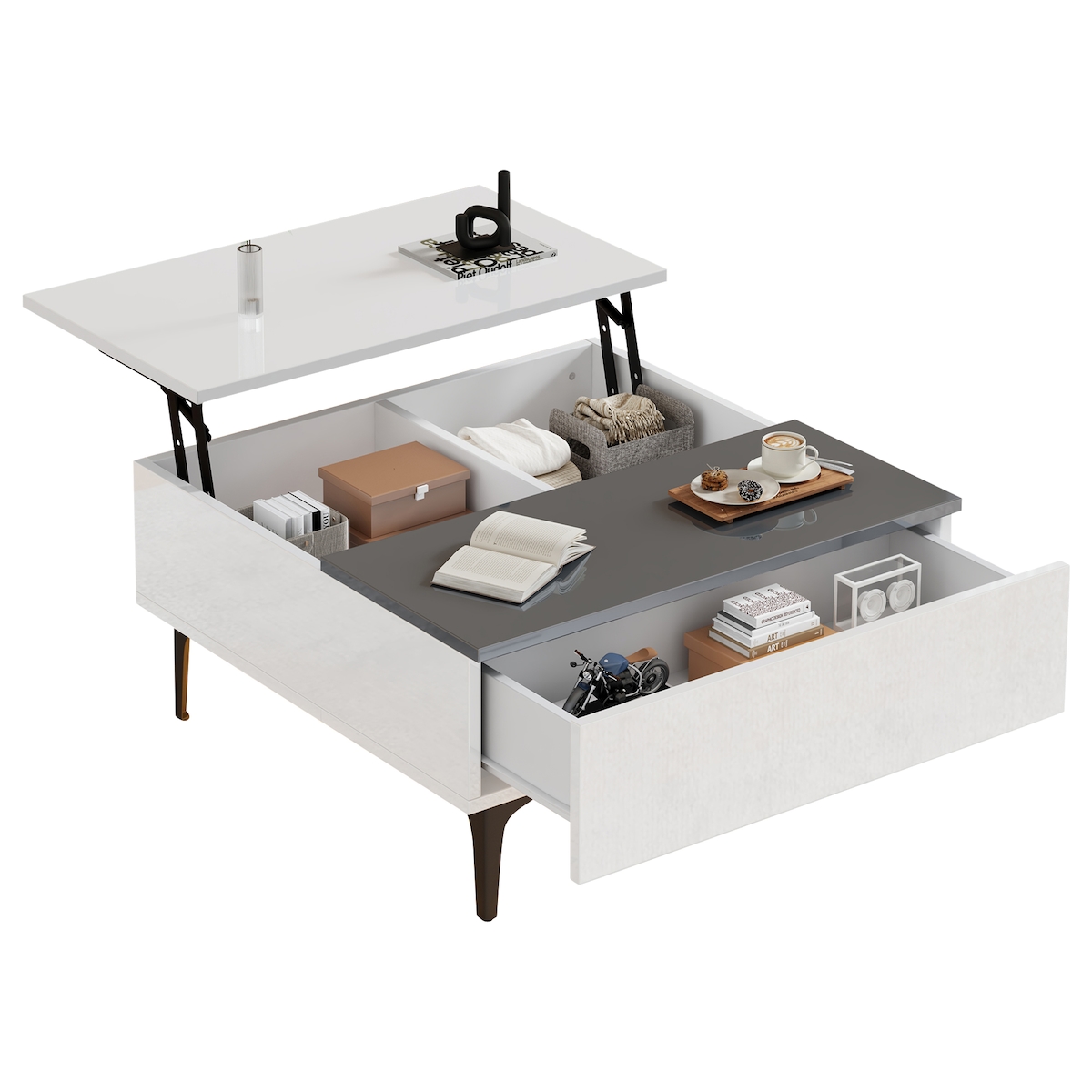 OKWISH Moderner Couchtisch 70x70x35 cm, höhenverstellbarer Teetisch mit LED-Beleuchtung, Stauraum, Push-Pull-Schublade, weiß + grau