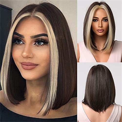parrucche caschetto castano per donna biondo mette in risalto la parte centrale dei capelli sintetici corti e lisci